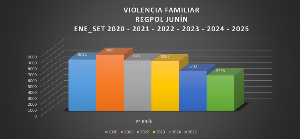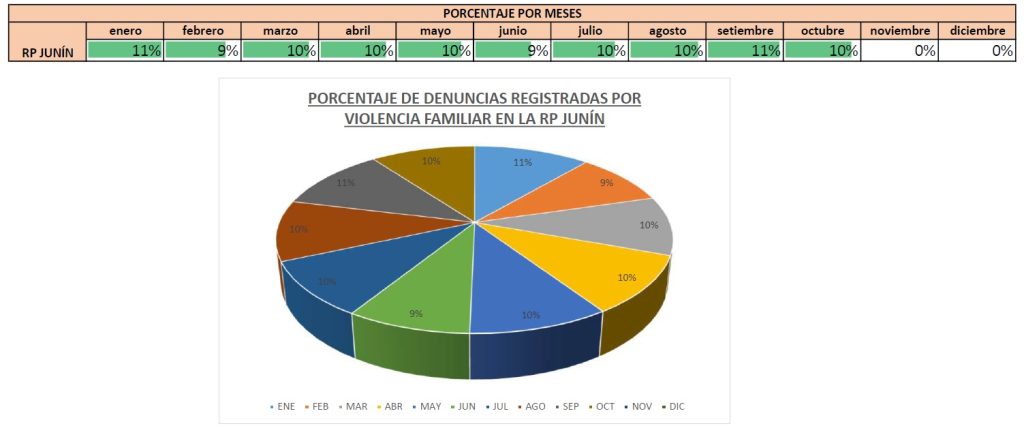 En esta sección, se presentan los indicadores más relevantes de las denuncias registradas por la Policía Nacional del Perú, desde el año 2019 al 2024 y del 2025 entre enero y octubre. A través de diversos gráficos, se observa que, el porcentaje de Denuncias por Violencia Familiar en la RP Junín; el 11% de las denuncias por violencia familiar en la RP Junín se registraron en enero y setiembre, siendo estos los meses con la mayor proporción. Por otro lado, febrero y junio fueron los meses con el menor porcentaje de denuncias, ambos representando un 9% del total anual. Los meses restantes (marzo, abril, mayo, julio, agosto, octubre, noviembre y diciembre) mantuvieron una participación relativamente estable, contribuyendo cada uno con un 10% del total de denuncias.